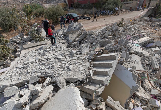 Palestinian children play on top of a demolished house in the West Bank village of Rojeeb, east of Nablus, 2 November 2020 (AP)