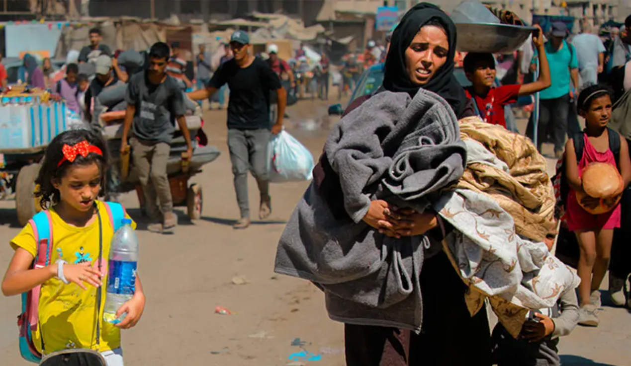 A mother and her daughter rush through the streets of Deir Albalah, carrying a blanket and a few belongings as they flee their home after evacuation orders. (Photo: UNFPA)